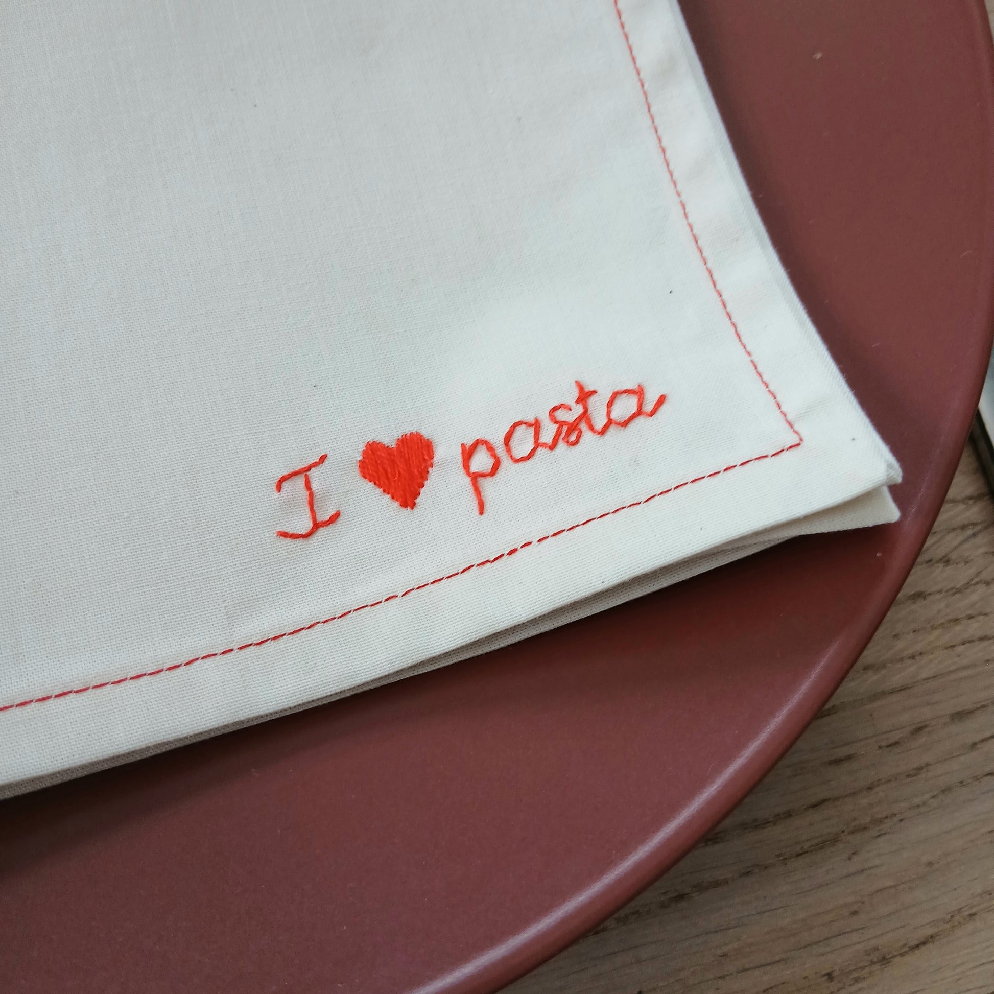 Ces serviettes de table en coton bio, brodées à la main, sauront ravir les inconditionnels des pâtes !