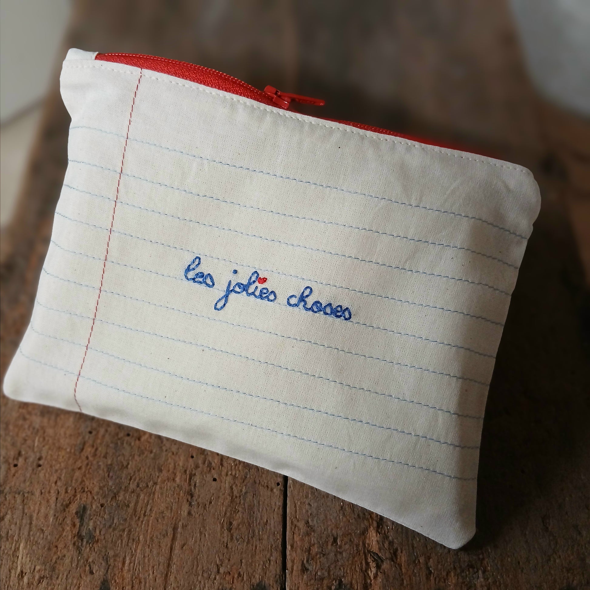 En coton bio GOTS, un design feuille de cahier et quelques mots brodés à la main, j'ai imaginé cette pochette comme un objet utile, poétique et intemporel. Corinne