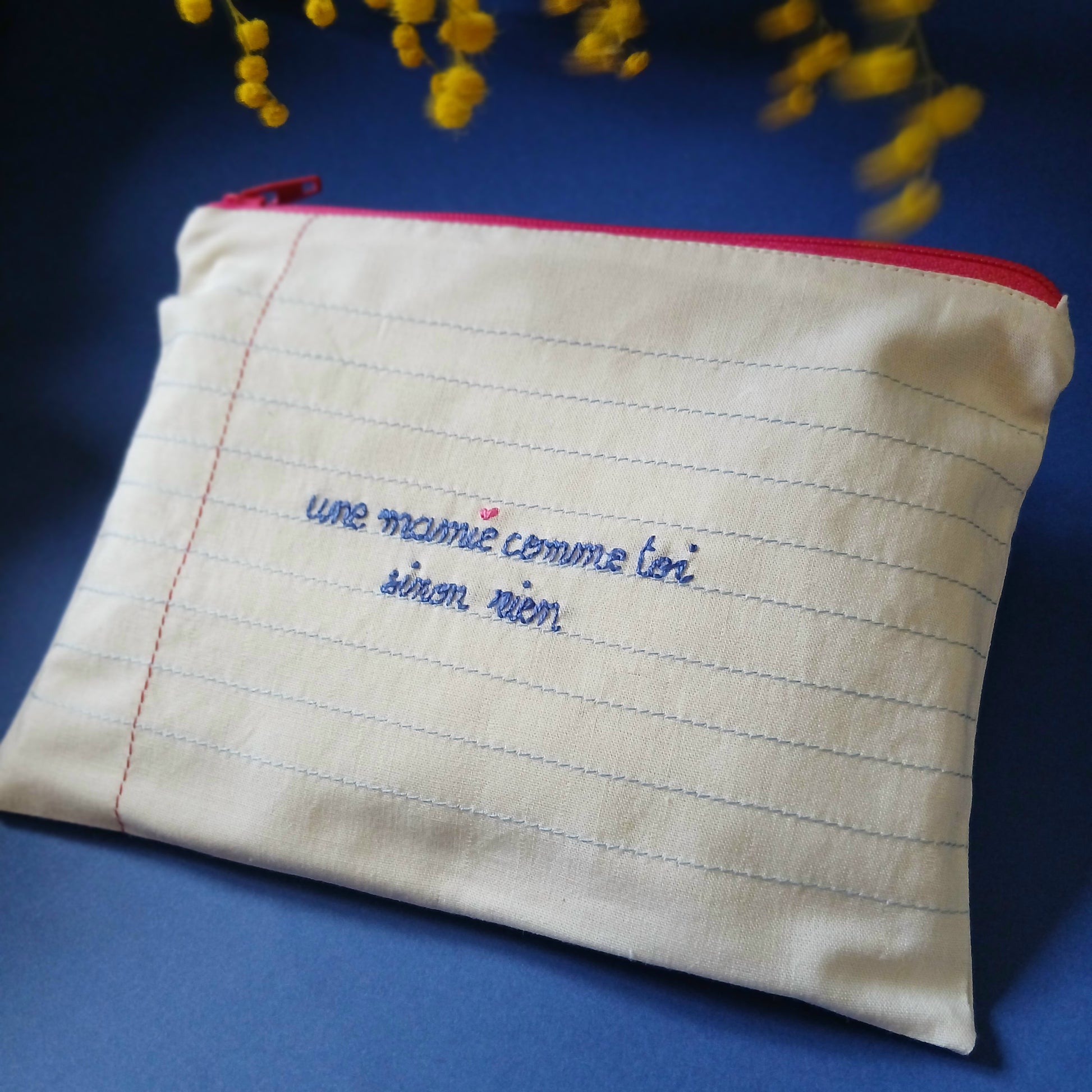 En coton bio GOTS, un design feuille de cahier et quelques mots brodés à la main pour lui dire combien elle compte pour vous...